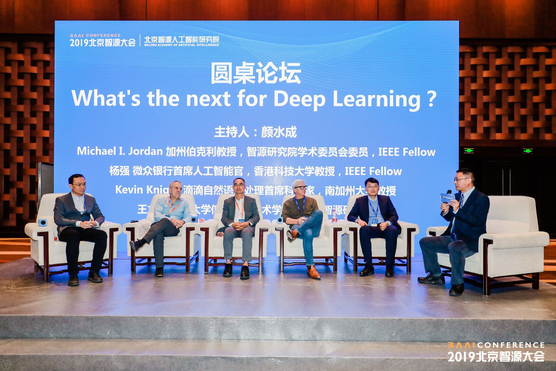 圍繞“深度學習下一步”,顏水成博士與加州大學伯克利分校教授 Michael I. Jordan,香港科技大學教授楊強,南加州大學教授 Kevin Knight,北京大學信息科技技術學院教授王立威,以及清華大學計算機系長聘教授朱軍展開討論。